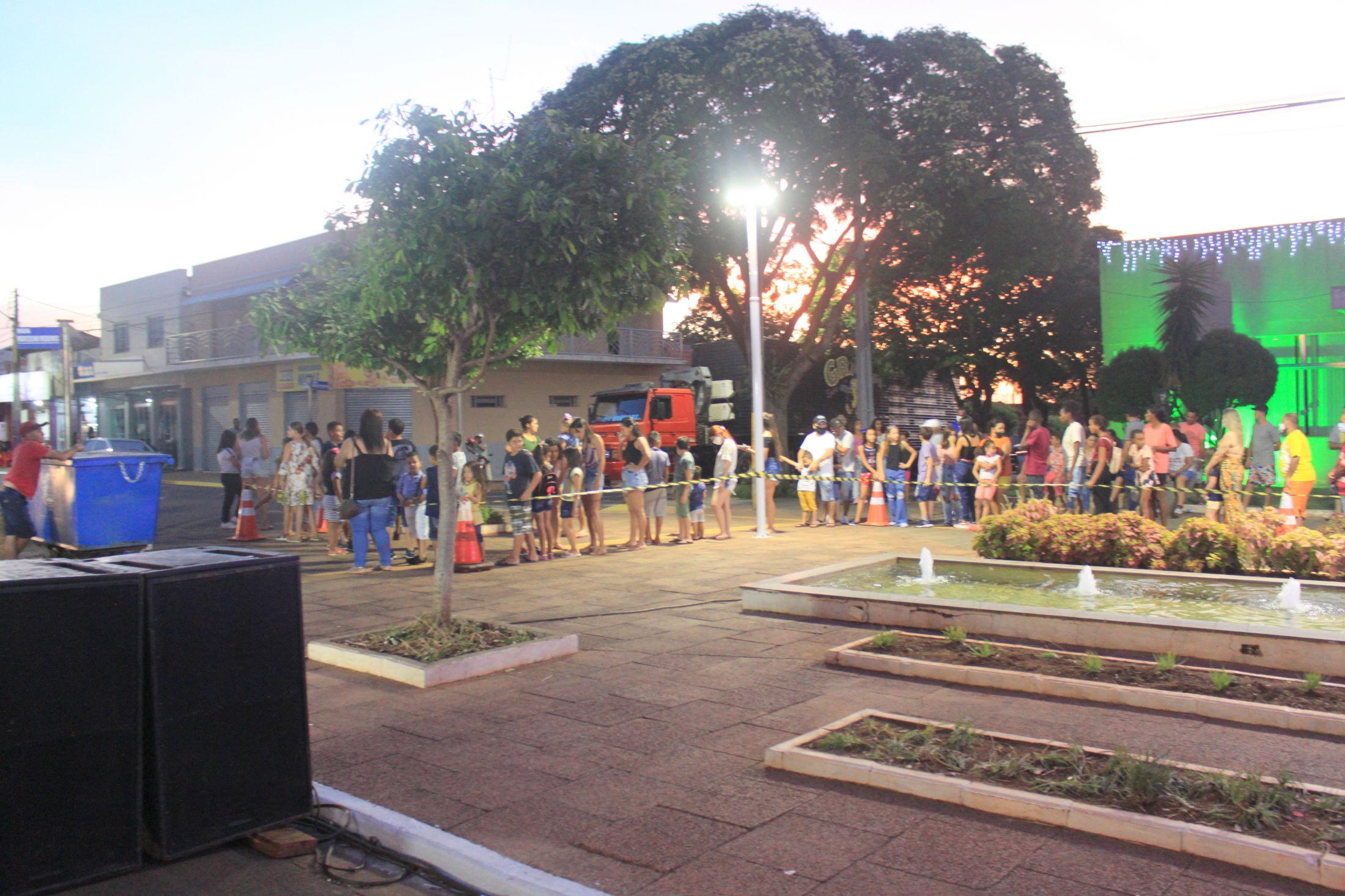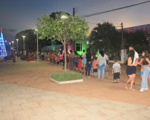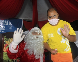 E o Papai Noel chegou e de trenzinho às 19h30min e já havia uma multidão de crianças aguardando o bom velhinho e a criançada fez a festa com direito a fotos, selfies e distribuição de balas.