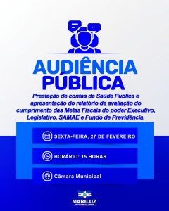 Na sexta-feira, 27 de fevereiro, será realizada Audiência Pública no plenário da Câmara Municipal de Vereadores